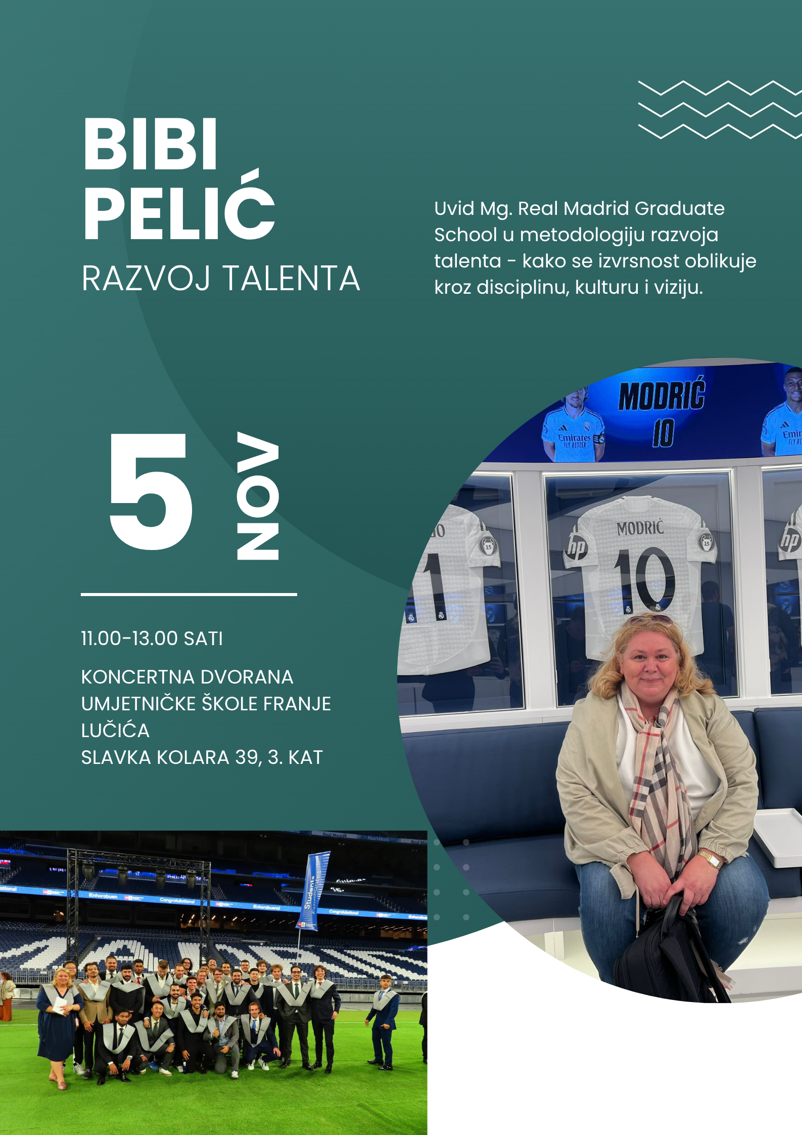 Predavanje posvećeno razvoju talenta donosi nove uvide i primjenjive metode u prepoznavanju i poticanju potencijala učenika, temeljene na iskustvima jedne od najuspješnijih europskih škola razvoja sportskih talenata, one slavnoga španjolskoga sportskog kluba Real Madrid. Predavačica Bibi Pelić violinistica je s dugogodišnjom karijerom u Češkoj, diplomantica praške akademije izvedbenih umjetnosti te nositeljice titule magistre sa Real Madrid Graduate School – Universidad Europea.